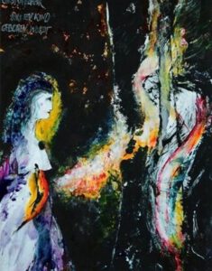 Op een donker vlak rijst een engel op, als bode die het licht naar Maria overbrengt. Het is de klassieke annunciatie-scène: de aankondiging van Jezus’ geboorte. Maria is ontvankelijk afgebeeld, als een bruid met sluiers. Haar kleding is paarsachtig, de kleur van beproeving. Het geheim van het licht dat in het midden zichtbaar gemaakt is, gaat van de engel over naar haar buik. De tekst, bijna onzichtbaar, is: Soms breekt uw licht in mensen door, onstuitbaar, zoals een kind geboren wordt.